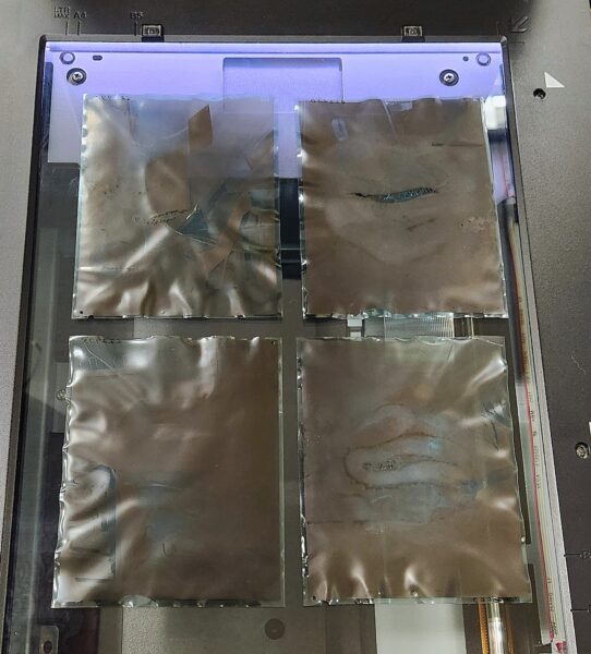 Each file is given a brief condition report specifying what stage of vinegar syndrome it is at before each negative is digitized. Due to their fragile nature, film holders can not be used to hold the negatives in place on the scanner and the negatives are instead carefully placed on the flatbed with some space between each other.