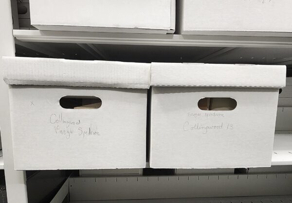 The first preservation step that is taken is isolating any film that may or may not have vinegar syndrome. This is due to vinegar syndrome’s tendency to spread to materials it is in close proximity with. Using the Collingwood collection as an example, any negatives with noticeable signs of deterioration were placed into separate boxes labelled “Vinegar Syndrome” until they are ready to be catalogued and housed.