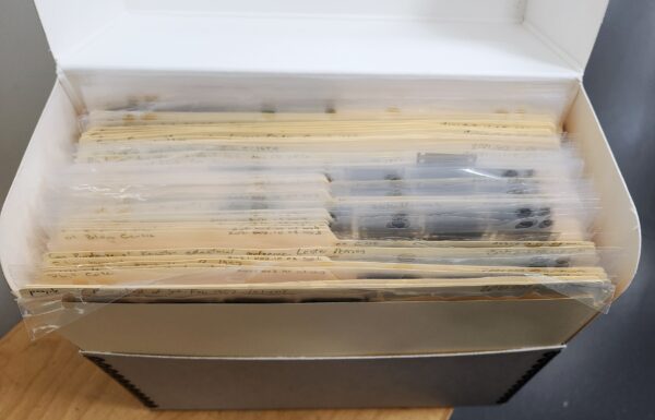 Once digitized, the negatives are slipped into archival quality plastic negative preservers where they are then placed into a file folder indicating its reference number, title, and year of creation. A stack of around sixty files, approximately 240 negatives, can fit into one legal-sized document box. Once a box has been filled, it is ready to be packaged for cold storage.
