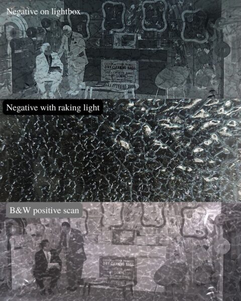 Stage two, where the film curls slightly and may have a slight smell of vinegar. The negative below was protected from curling due to being compressed in its original housing, however the raking light reveals some warping on the film base.