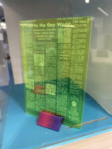 The team at the Archives told me about an article from 1963, an artifact that they show on their Pink Library Tour. Then I went through archived On The Record, Ryersion, Eyeopener issues and collected various articles about queer and trans stories. I selected the ones I laser cut based on input from the DME team and the Archives.