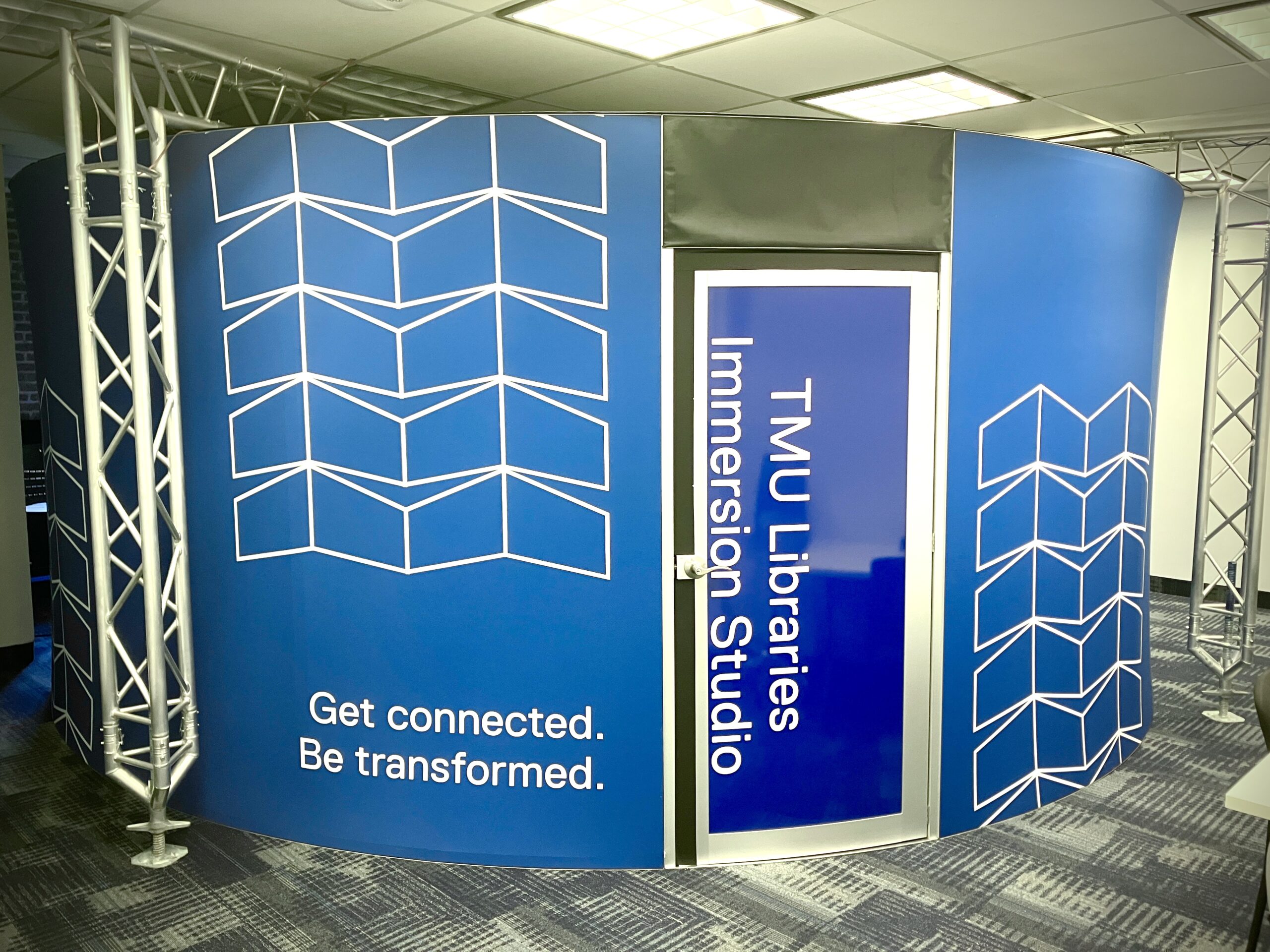 The Immersion Studio is designed for students and faculty looking to explore new forms of collaborative, shared, and immersive experiences, whether that be VR simulations, visualizations or immersive exhibitions. It allows for immersive media and shared VR experiences to be experienced by multiple students or faculty (up to 10 seated on chairs or 15 sitting on floor), and allows participants to view VR or 360° content without the need to wear a VR headset. Considering some of the drawbacks of traditional VR headsets such as eye strain from HMD lenses, frequent cleaning for safe use between multiple people, and an overall singular experience, the Immersion Studio can be seen as a more attractive alternative for viewing VR content across a larger group of students and faculty.